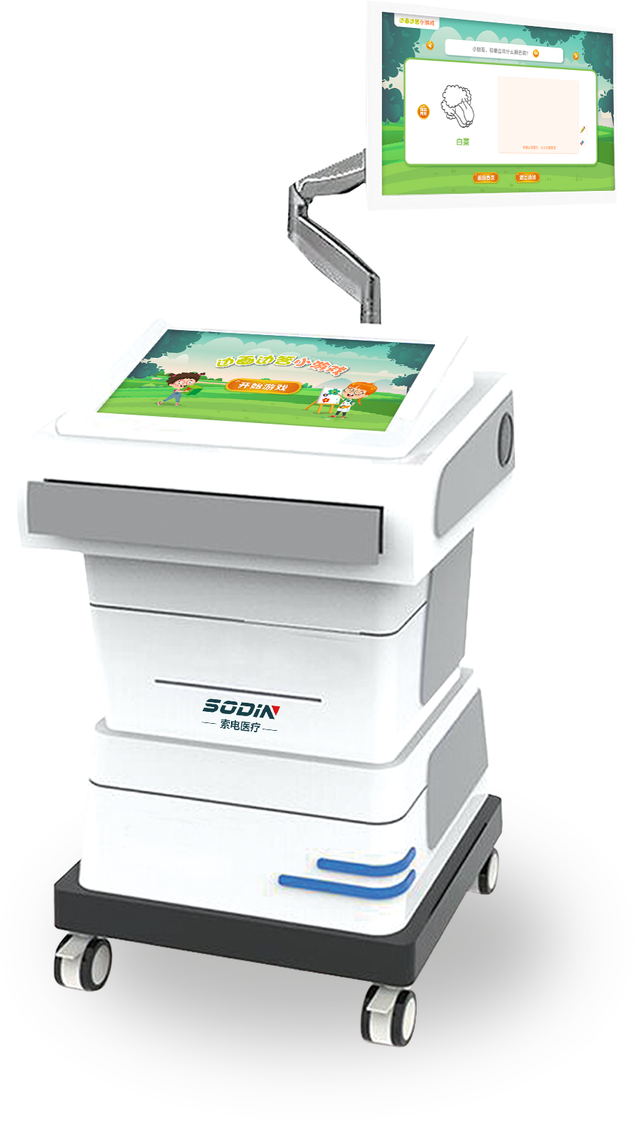 丰富的训练资源:为提高儿童积极性,康复训练提供了互动游戏和趣味问答两种训练模式。几十种互动游戏、上千道趣味问答题、不同难度等级,配合语音播报、智能语音识别技术,可对儿童9项能力进行全方位训练。